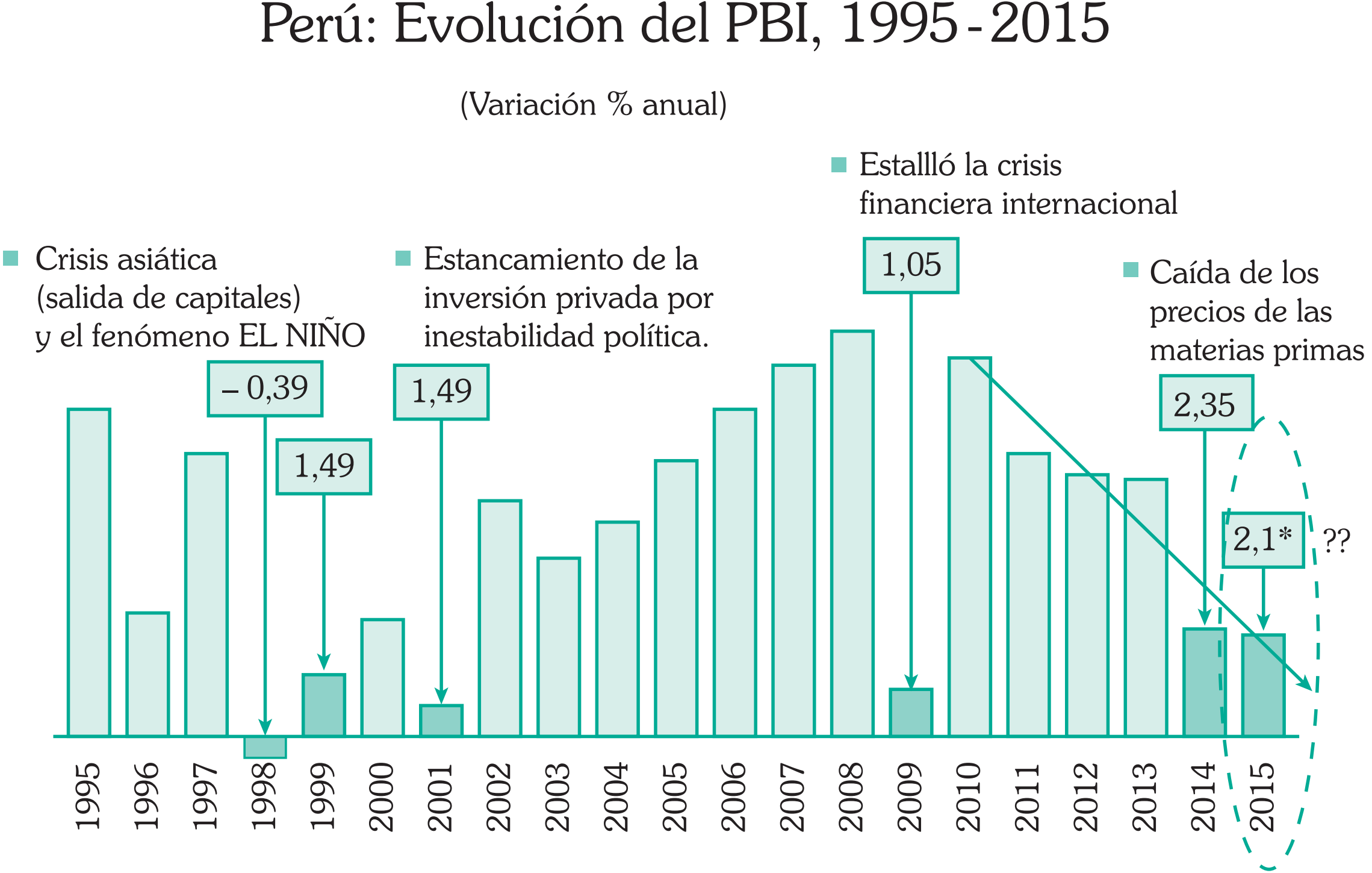 Según proyecciones del Bank of America Merril Lynch, el PBI de nuestro país crecería apenas 2,1% en 2015, por lo que continuaría la desaceleración económica iniciada en 2009 y que no ha podido remontarse hasta hoy. En 2014 el crecimiento solo alcanzó el 2,35% y fue el más débil de los cinco últimos años y en febrero último solo se creció en 0,94%, muy por debajo de las expectativas empresariales. Estas cifras marcan el crecimiento más bajo observado desde el año 2009; además, se espera que este año el dólar alcance su “precio de equilibrio”, estimado en S/. 3.30.